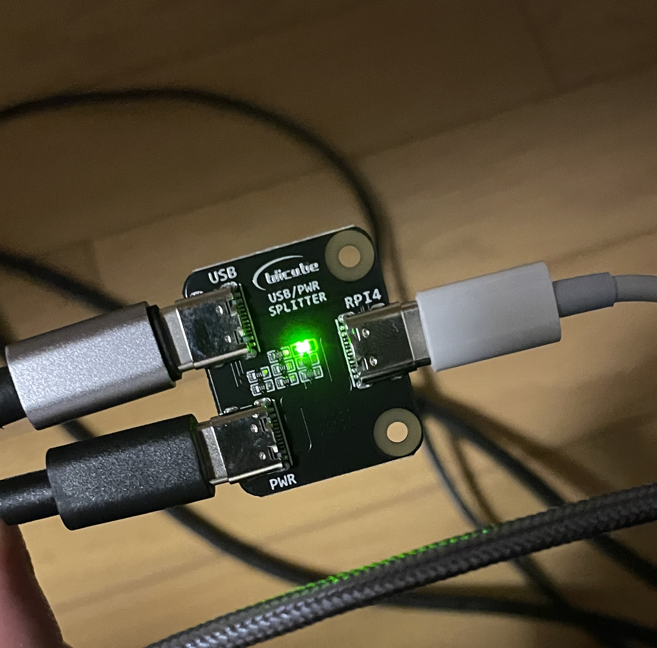 RaspberryPiのType-C 1ポートでマウス・キーボードの信号制御と電源供給を行うために付属のスプリッターを使うようだ。