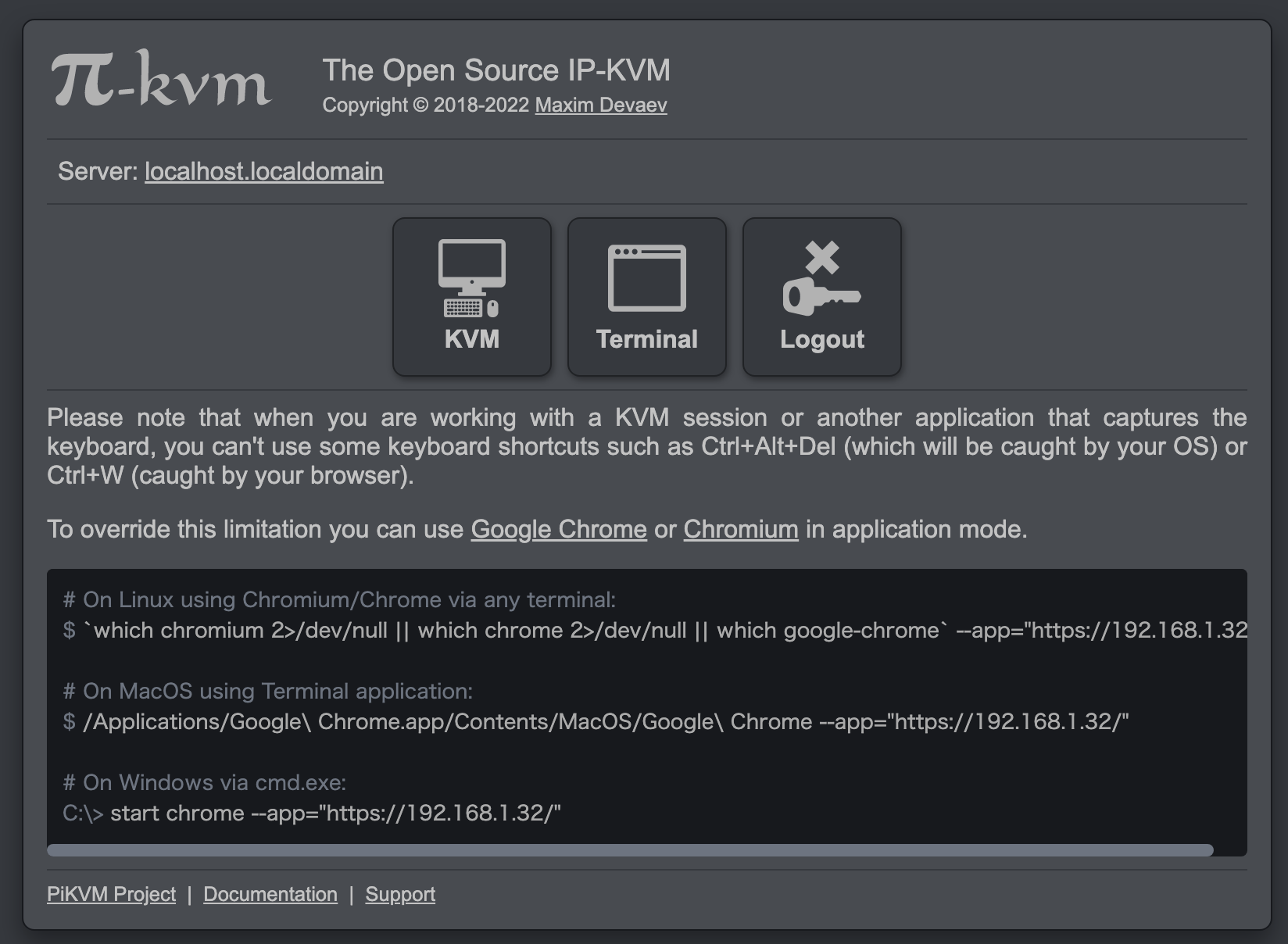 OLEDに表示されているIPアドレスをブラウザに打ち込んで表示する。ここで証明書エラーが出た場合は thisisunsafe と入力してログインページを出すことができる。admin/adminでログインしKVMを選択。